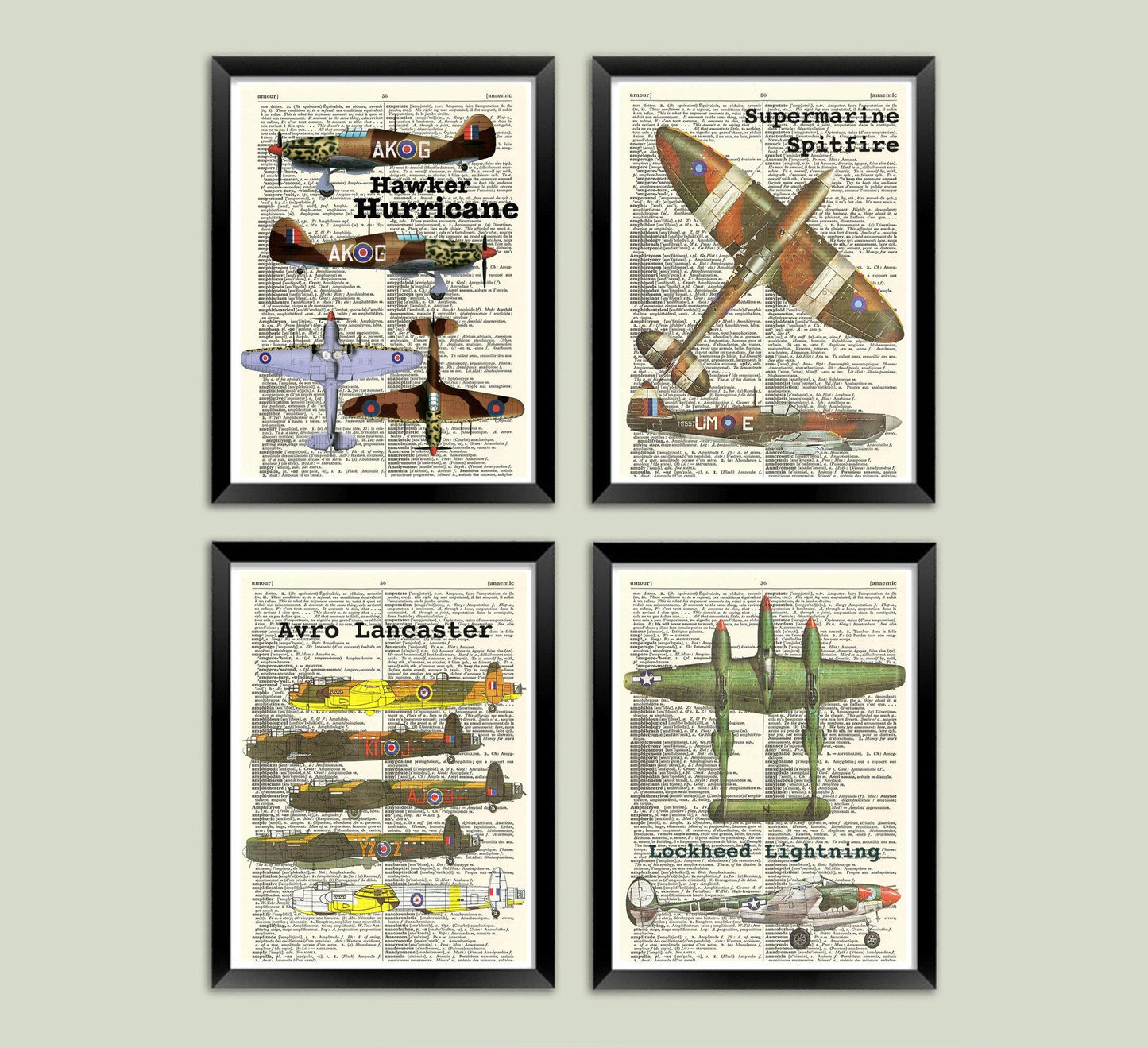 Estas obras de arte originales presentan muchos de los aviones clásicos de la Segunda Guerra Mundial. Famosos aviones de combate como el Spitfire y el Hurricane británicos que aparecieron en la Batalla de Gran Bretaña. El Mustang estadounidense y el distintivo Lockheed Lightning, y el Junkers JU87 (Stuka) alemán también están disponibles, así como otros aviones notables, incluidos los bombarderos Lancaster y Wellington.