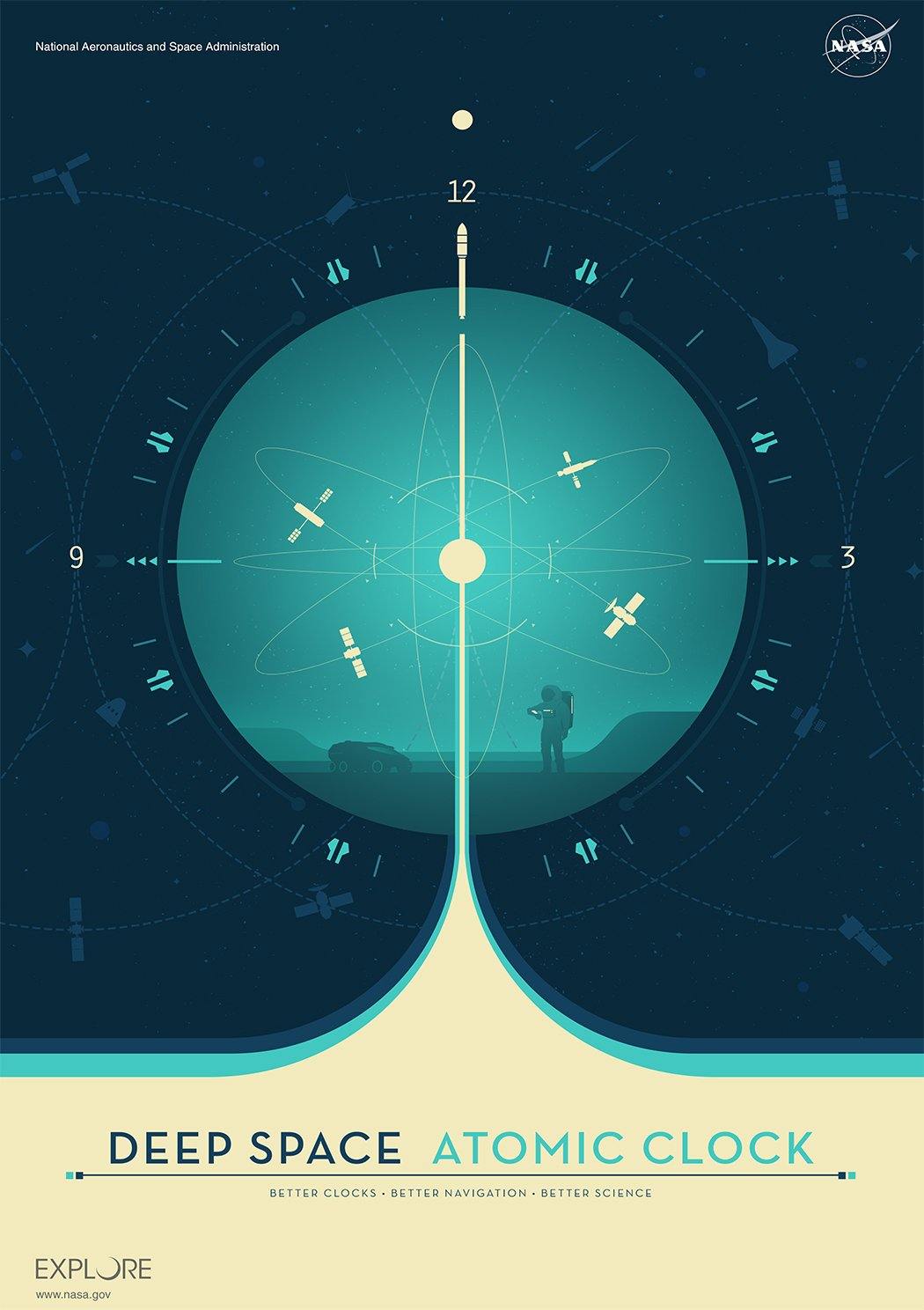 Tres carteles del Reloj Atómico, cortesía de NASA / JPL-Caltech.