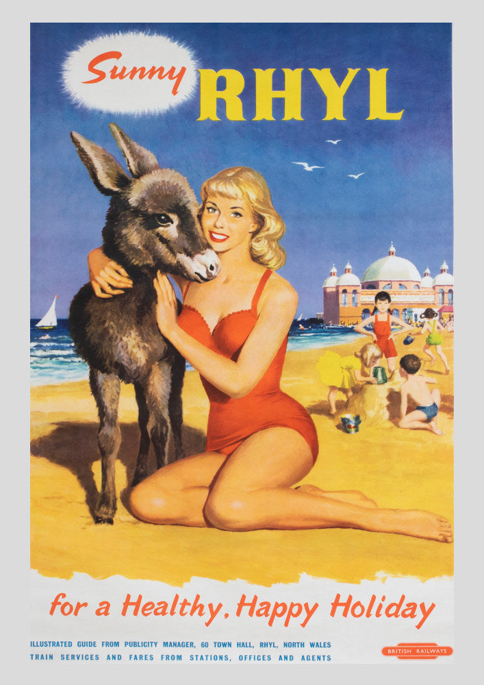 A beautiful travel poster from the last century, this British Railways advertisement for Rhyl, featuring a girl with a donkey, is produced on premium 200gsm satin photographic poster paper.