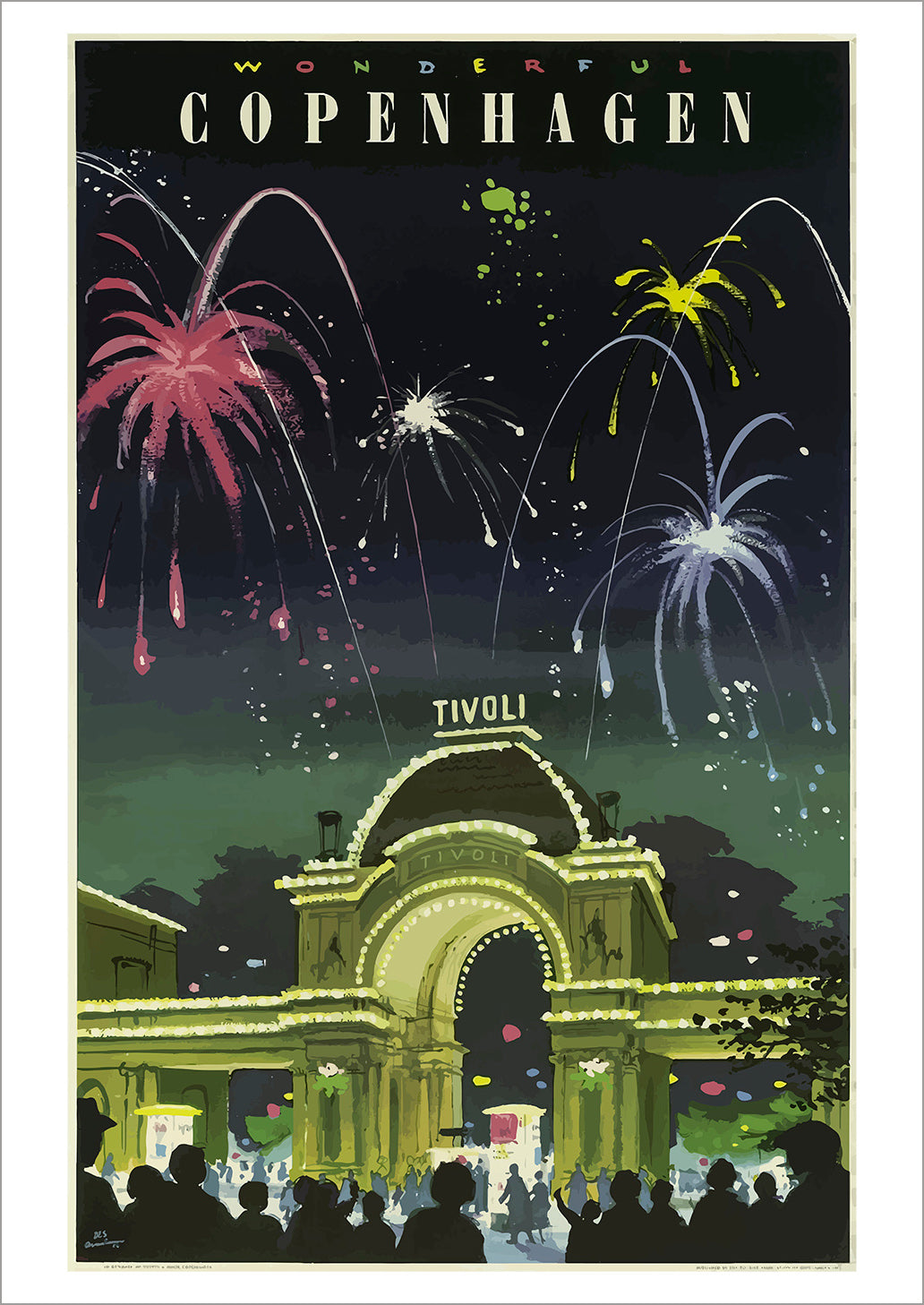 CARTEL DE FUEGOS ARTIFICIALES DE TIVOLI: Impresión del anuncio turístico de Copenhague vintage