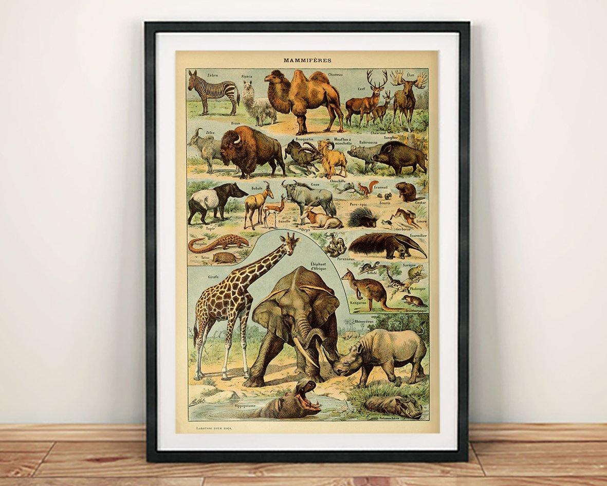 CARTEL DE MAMÍFEROS VINTAGE: Impresión de arte francés con elefante, jirafa