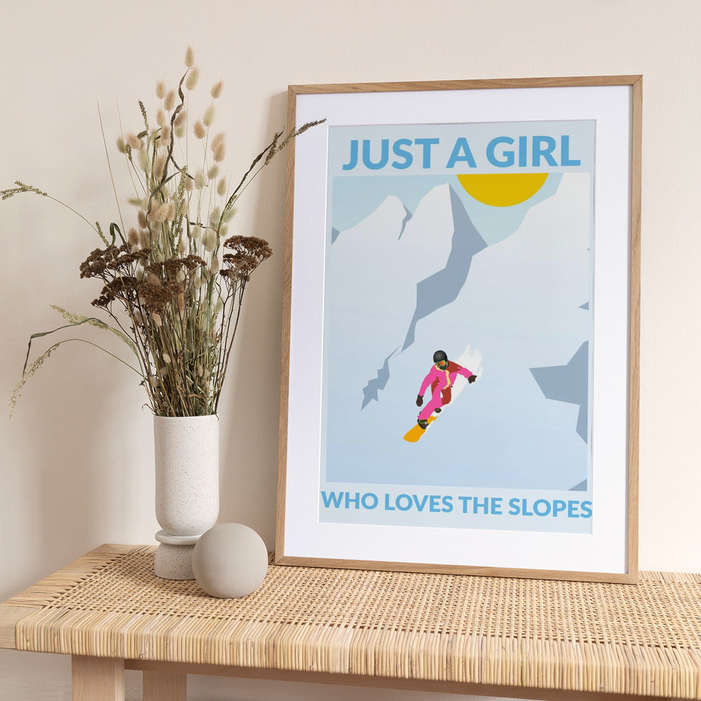 Just a Girl Who Loves the Slopes by WallChart Art Studio - an original artwork, produced on premium 210gsm paper with white border, ready for framing.