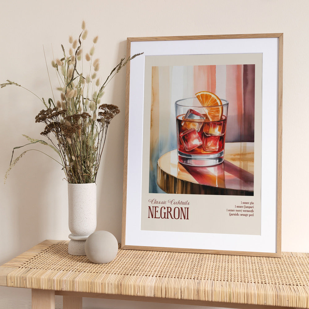Classic Cocktails - Negroni by Andreas Magnusson - artwork printed on premium 210gsm satin paper with white border. Perfect poster for the kitchen, bar, or anywhere your favourite beverage is enjoyed!