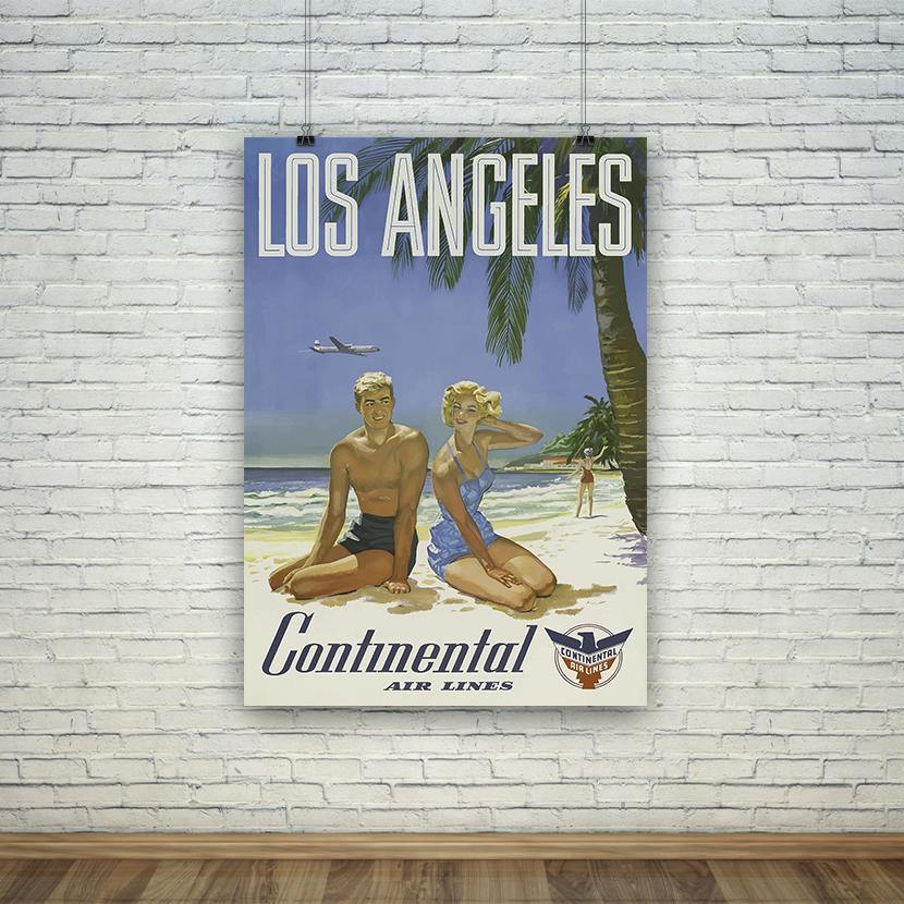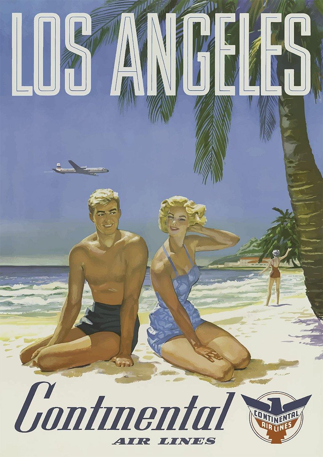 Een prachtige reisposter uit de vorige eeuw, met een man en een vrouw op een strand in Los Angeles, deze herdruk is geproduceerd op premium 200gsm satijn fotopapierpapier.