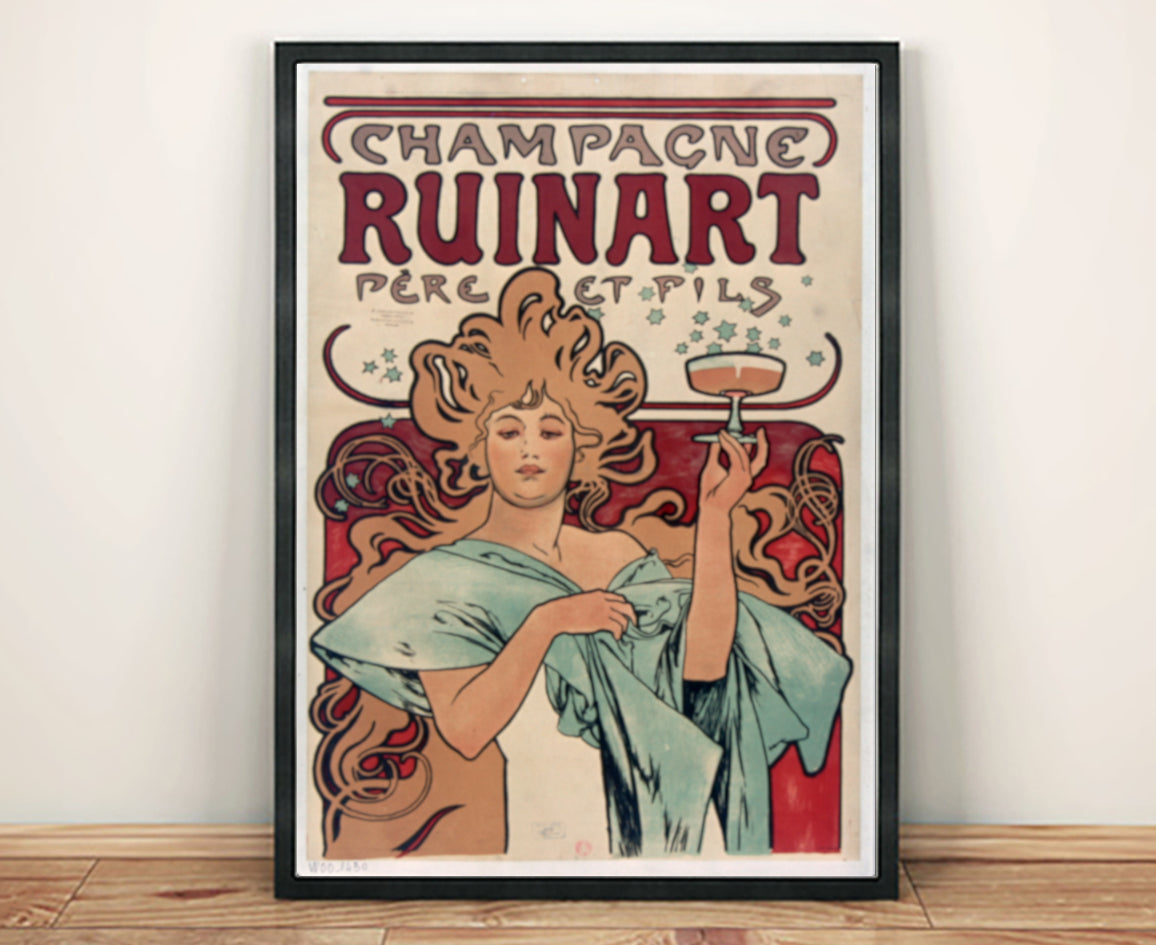 A reproduction print of a wonderful Ruinart Champage advert, created by the artist Alphonse Mucha and printed on premium 200gsm satin paper.