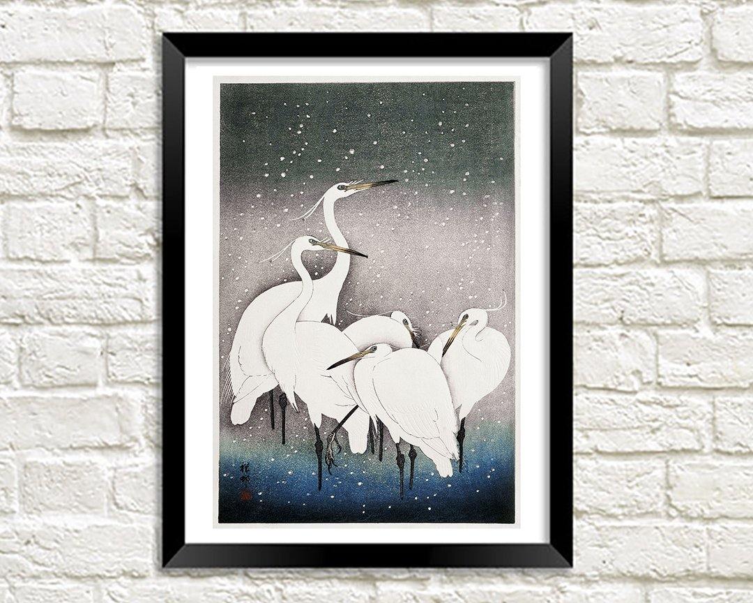 GROUP OF EGRETS PRINT: Vintage White Birds Art Illustration by Ohara Koson