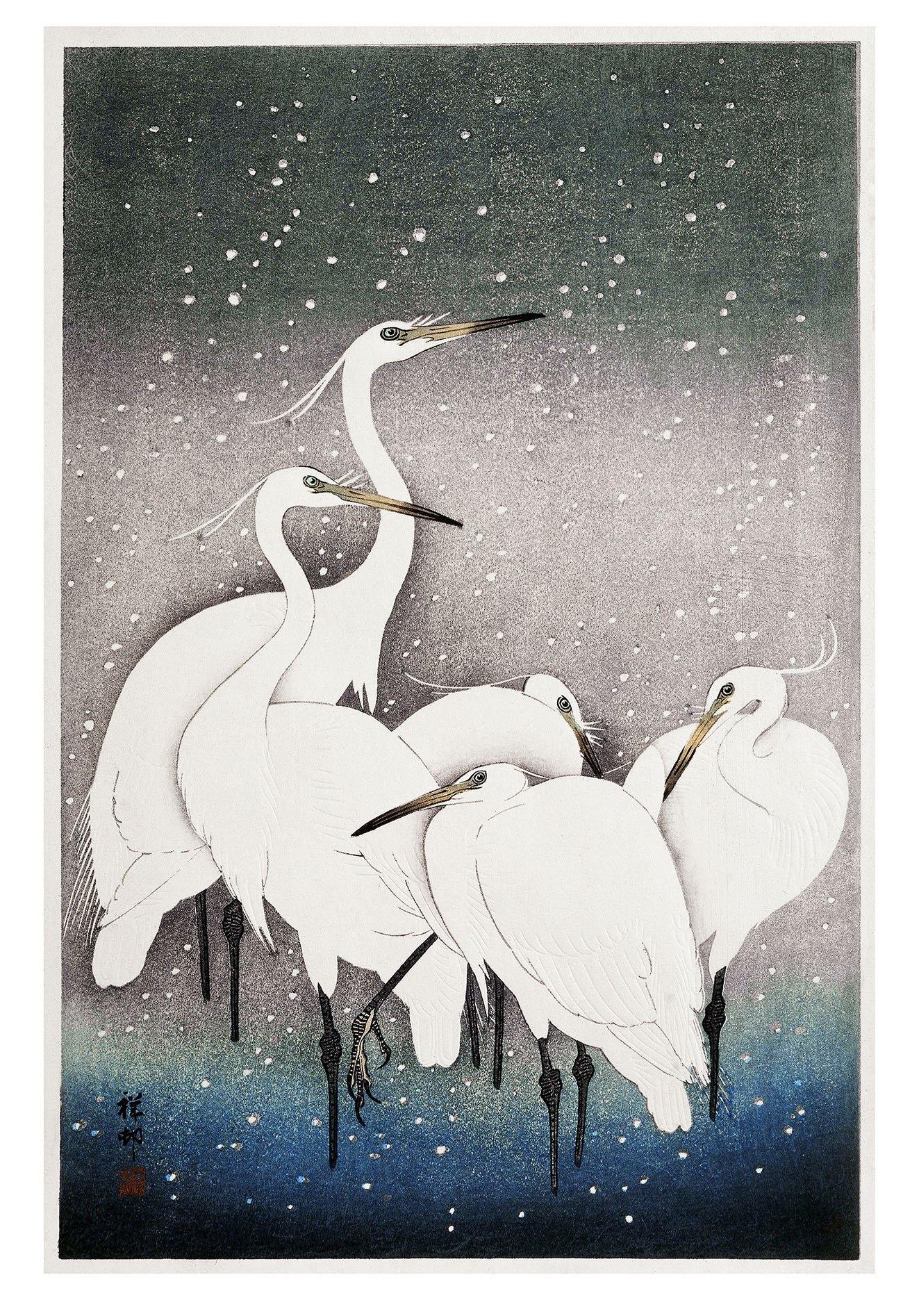 Group of Egrets (1925 - 1936) is a beautiful artwork featuring white birds in snow, by Ohara Koson. The print has been reproduced with light-fast inks on premium quality 210gsm matte paper.