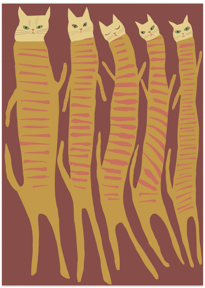 Five long cats by Sharyn Bursic - an original composition, printed on premium 210gsm matte paper with white border. Quirky, fun and family friendly artwork for all ages.