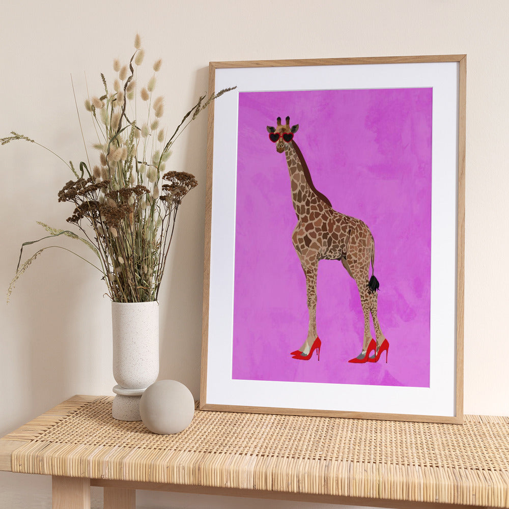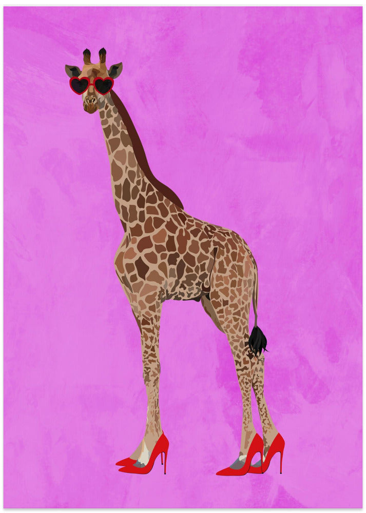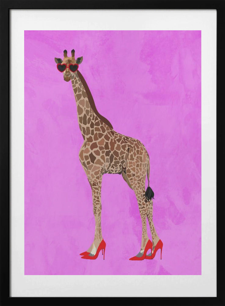 Giraffe wearing heels and heart glasses pink - Art Print by Sarah Manovski