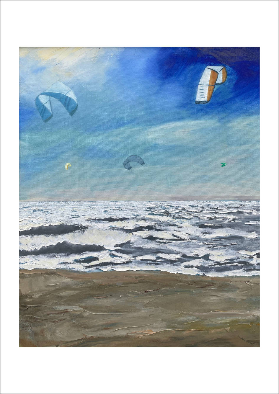This is a limited edition print (of 50) from the oil painting Kite Surfers, by Mark London. Painted with palette knives and featuring surfers off the coast of Monterey, California, the artwork has been printed with light-fast inks on premium quality 210gsm matte art paper.