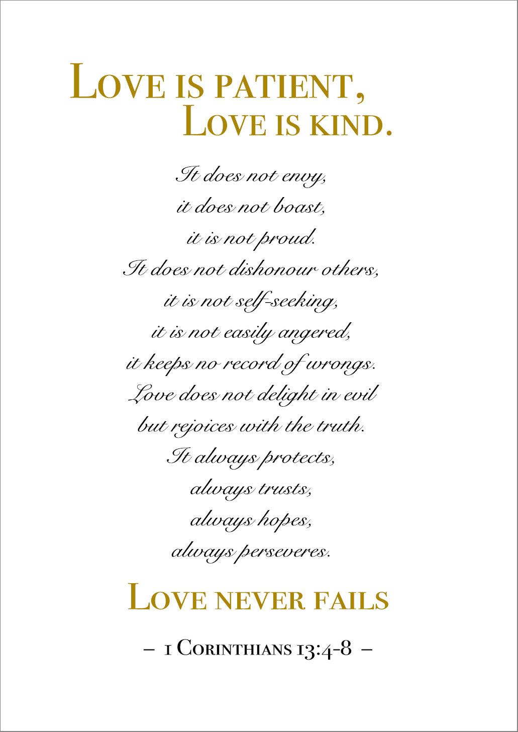 A stunning print of the verse Love is Patient, Love is Kind, a popular reading at weddings. The artwork has been printed with light-fast inks on premium quality 210gsm matte paper.