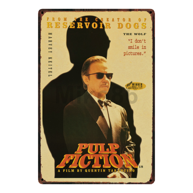 Retro style Quentin Tarantino movie images, printed on metal wall signs, 20 x 30cm. Each piece comes with a small hole in each corner for easy pinning.
