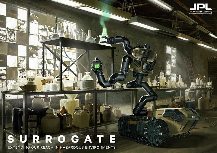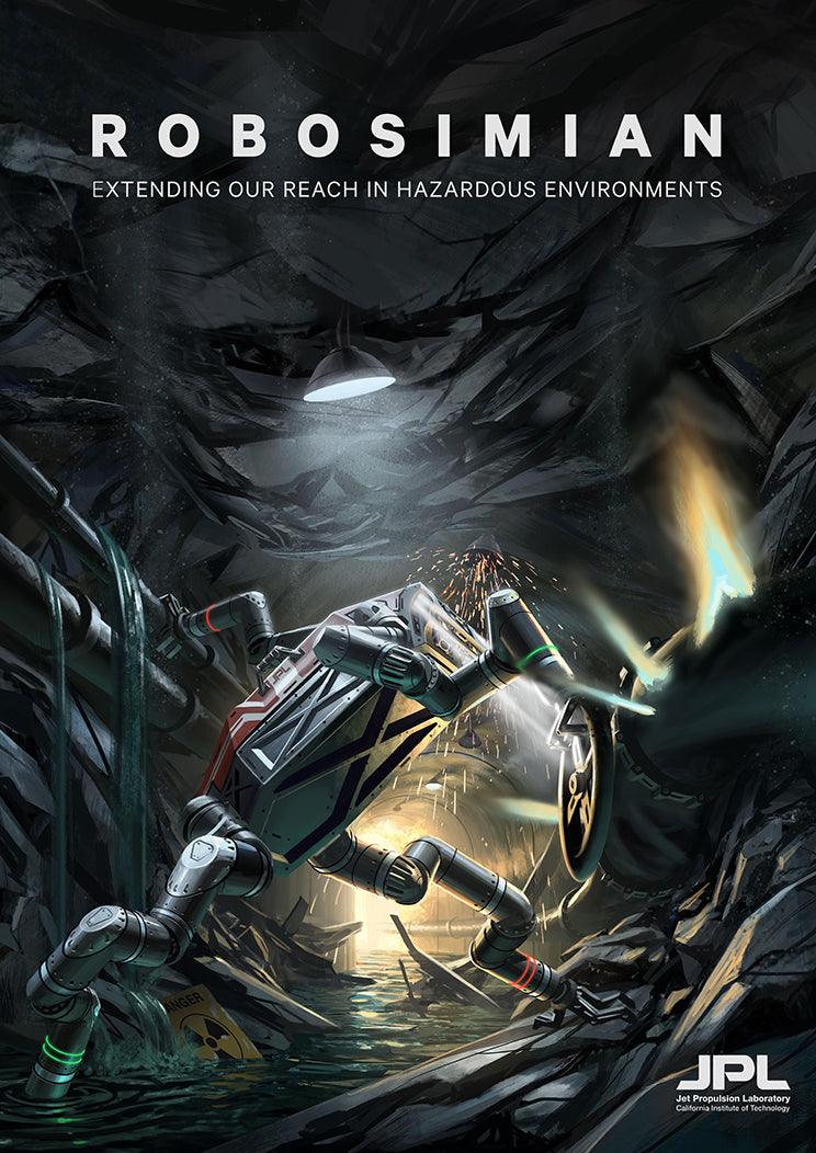 These robotics posters by JPL-Caltech are artist's concepts to show how robots could help with 'extending our reach in hazardous environments'. RoboSimian was in fact designed and built at the Jet Propulsion Laboratory to compete in the DARPA Robotics Challenge Finals.