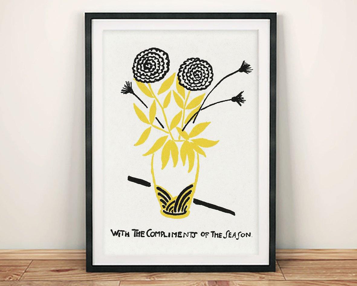 A lovely bright black and yellow print of flowers in a vase, 'With the compliments of the season (Design no.3)' is by American scientist and artist Henry Lyman Sayen. Originally dating from the turn of the 20th century, the artwork has been reproduced with light-fast inks on premium quality 210gsm matte paper.