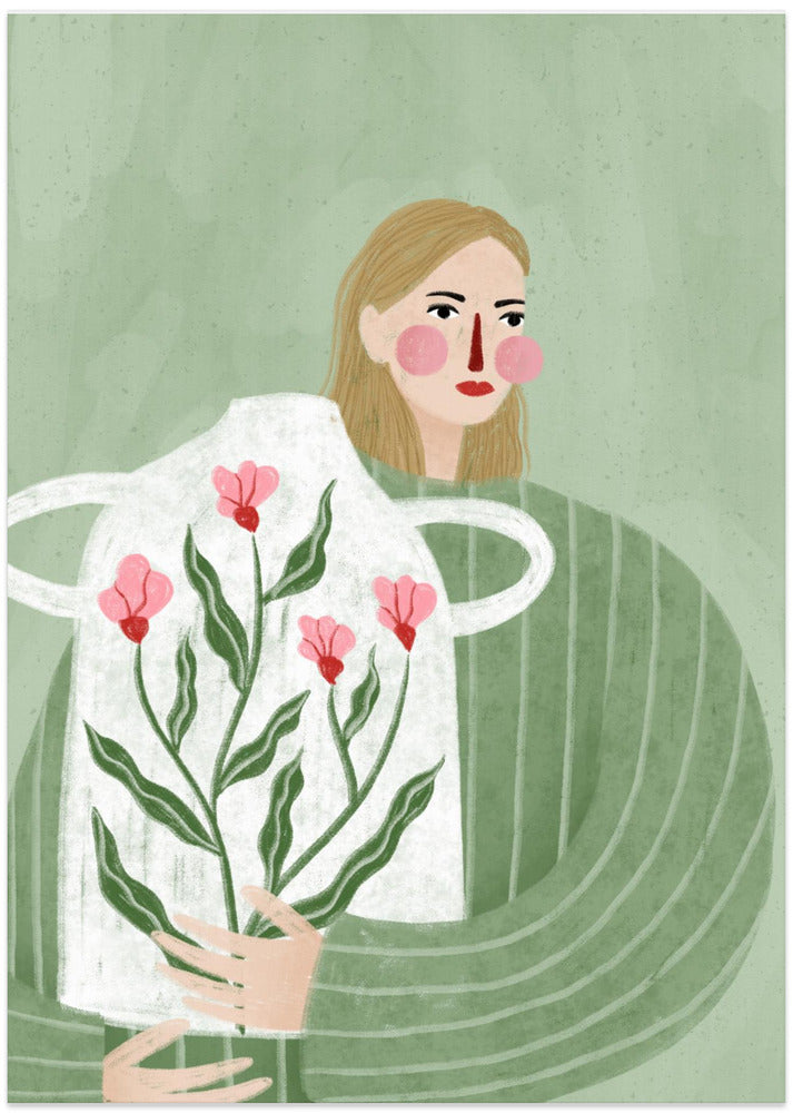 The Woman With Pink Vase by Bea Müller - an original artwork, printed on premium 210gsm matte paper with white border. Motherhood, diversity, female empowerment, and climate change are important personal topics for Bea, and they are recurring themes in this collection.