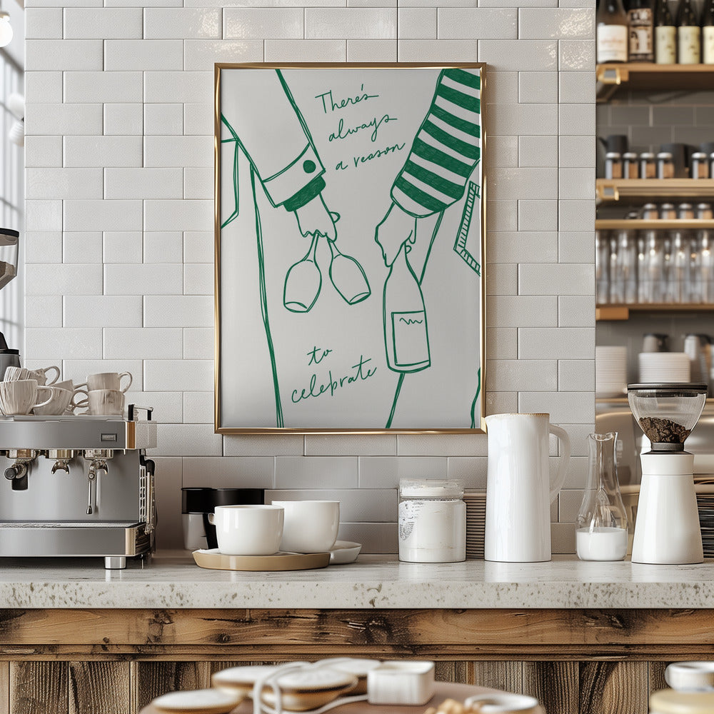 Woman holding wine bottle and wine glass (Green) - Wine Vin Femme Vert - Art Print by Rio Soléy