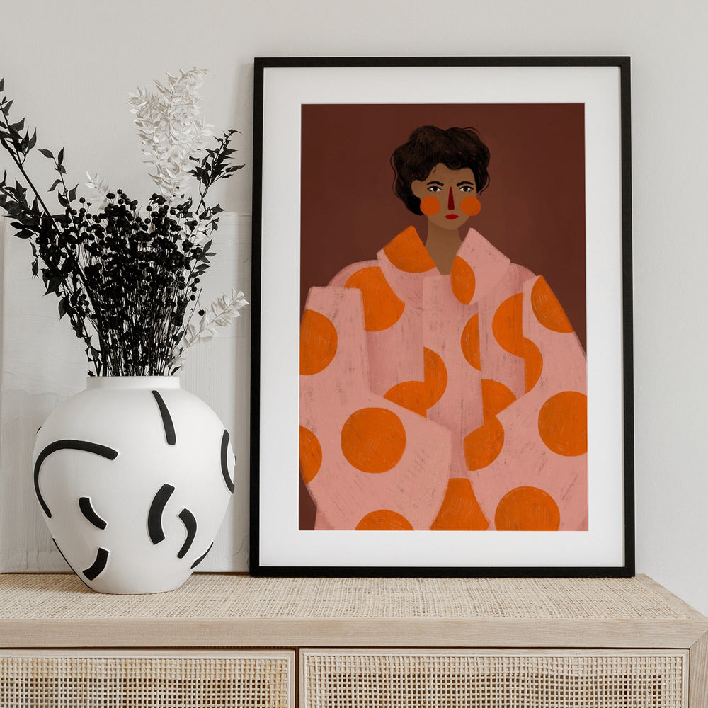 Woman With Orange Dots by Bea Müller - an original artwork, printed on premium 210gsm matte paper with white border. Motherhood, diversity, female empowerment, and climate change are important personal topics for Bea, and they are recurring themes in this collection.